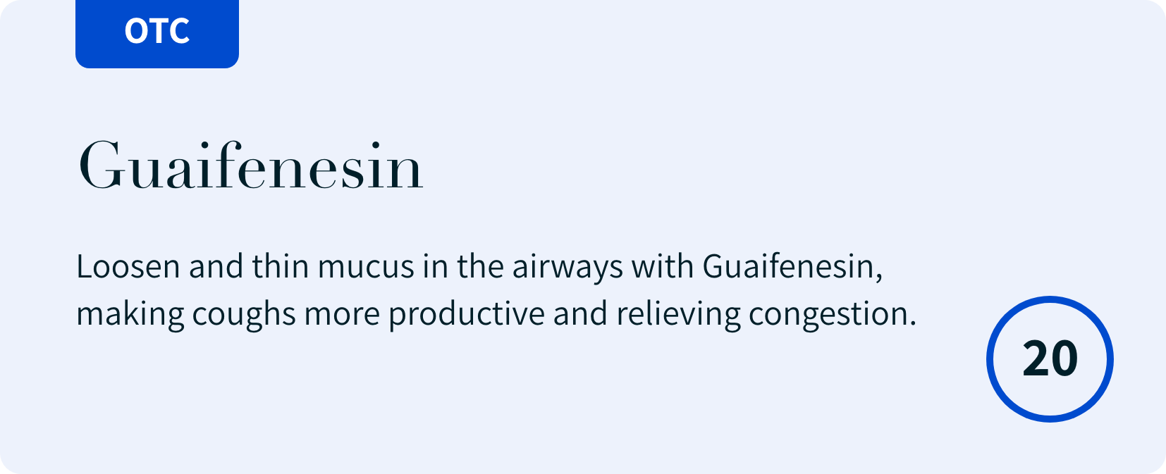 Guaifenesin (400 mg, 20 tablets): Loosen and thin mucus in the airways with Guaifenesin, making coughs more productive and relieving congestion. Read More…