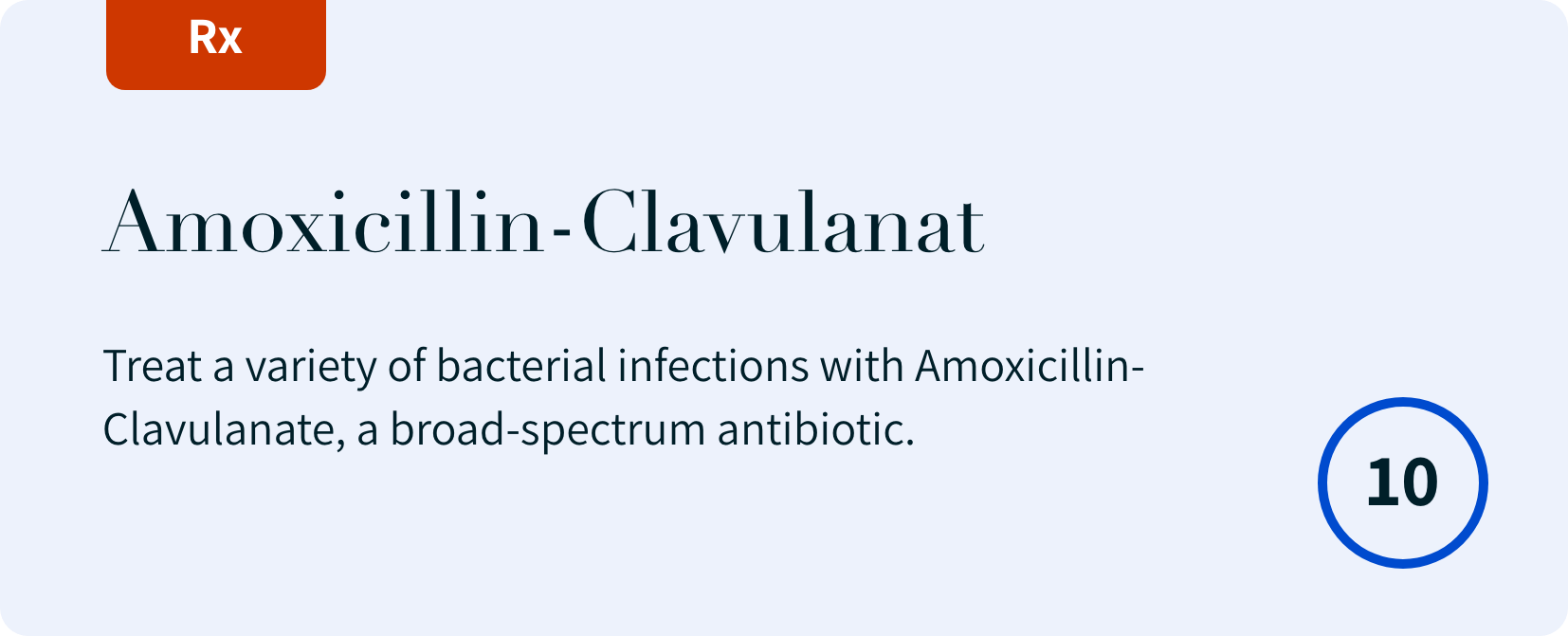 Amoxicillin-Clavulanate (875/125 mg, 20 tablets): Treat a variety of bacterial infections with Amoxicillin-Clavulanate, a broad-spectrum antibiotic. Read More…