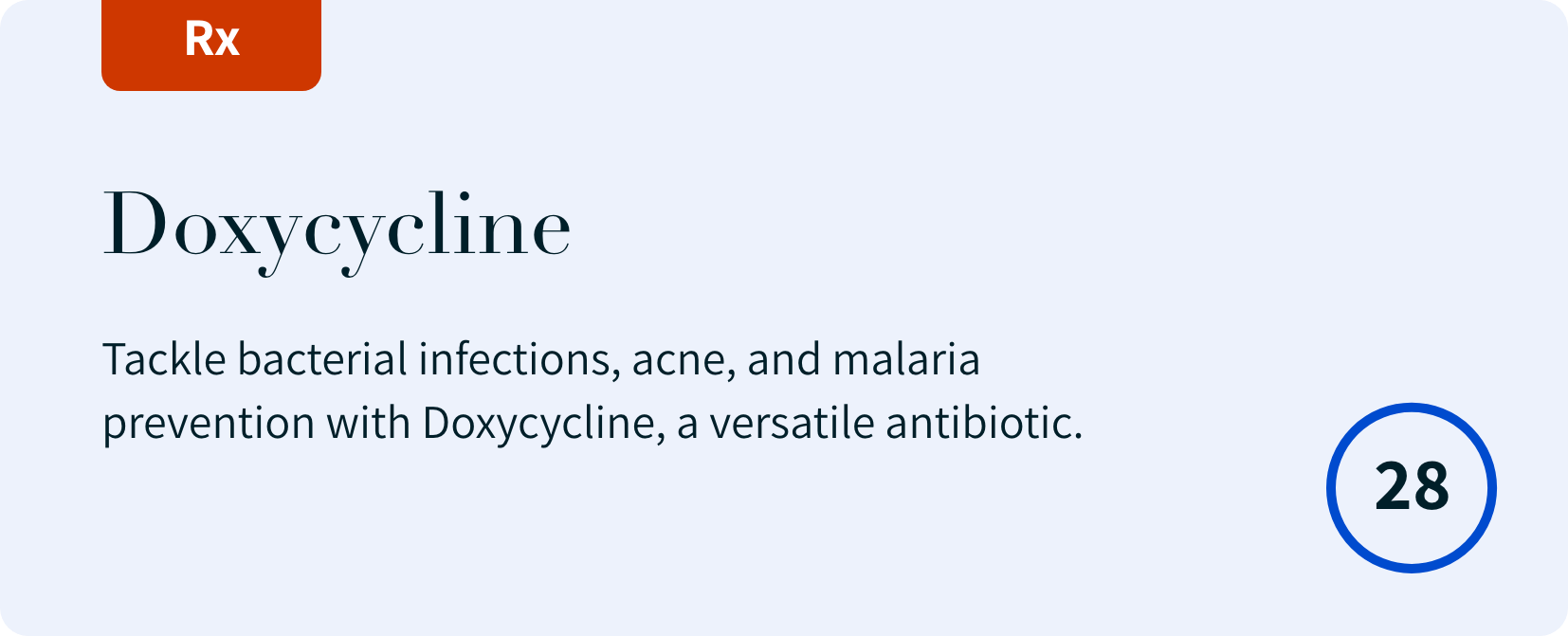 Doxycycline (100 mg, 28 tablets): Tackle bacterial infections, acne, and malaria prevention with Doxycycline, a versatile antibiotic. Read More…