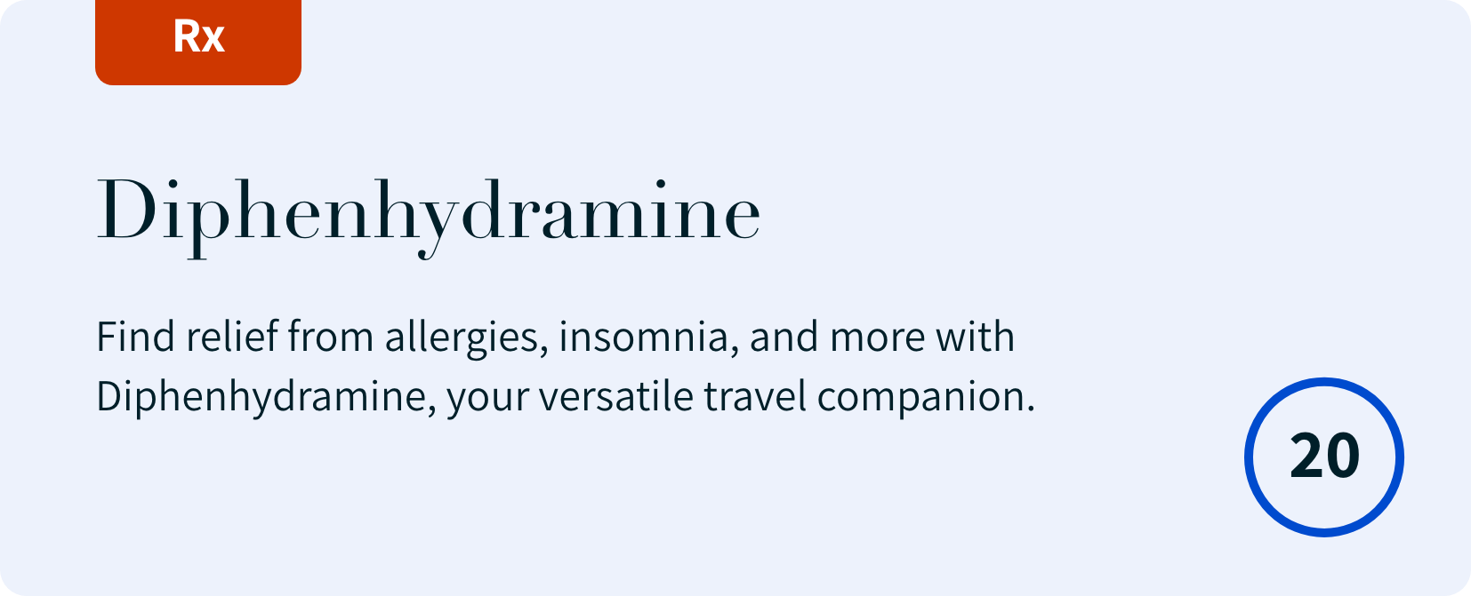 Diphenhydramine (25 mg, 20 tablets): Find relief from allergies, insomnia, and more with Diphenhydramine, your versatile travel companion. Read More…