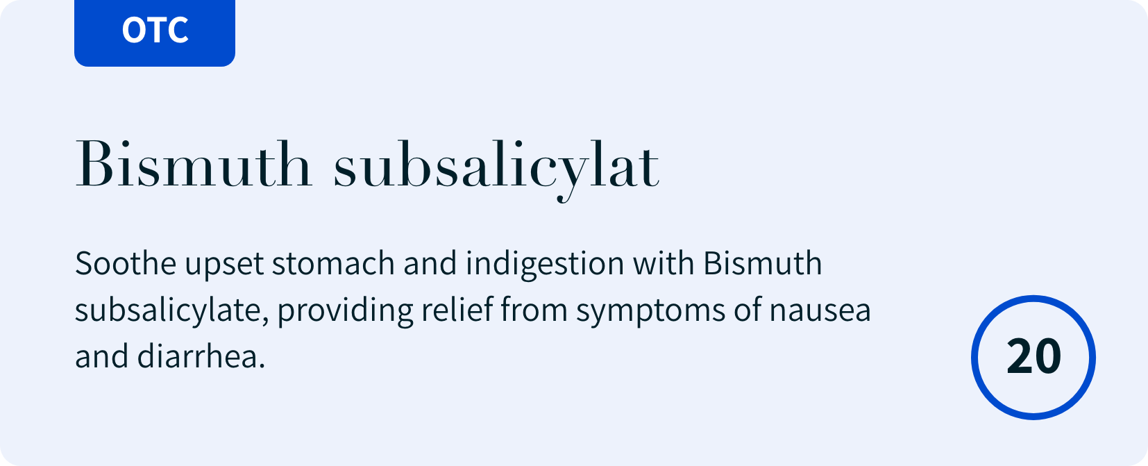 Bismuth subsalicylate (Pepto Bismol) (262 mg, 20 chewable tablets): Soothe upset stomach and indigestion with Bismuth subsalicylate, providing relief from symptoms of nausea and diarrhea. Read More…